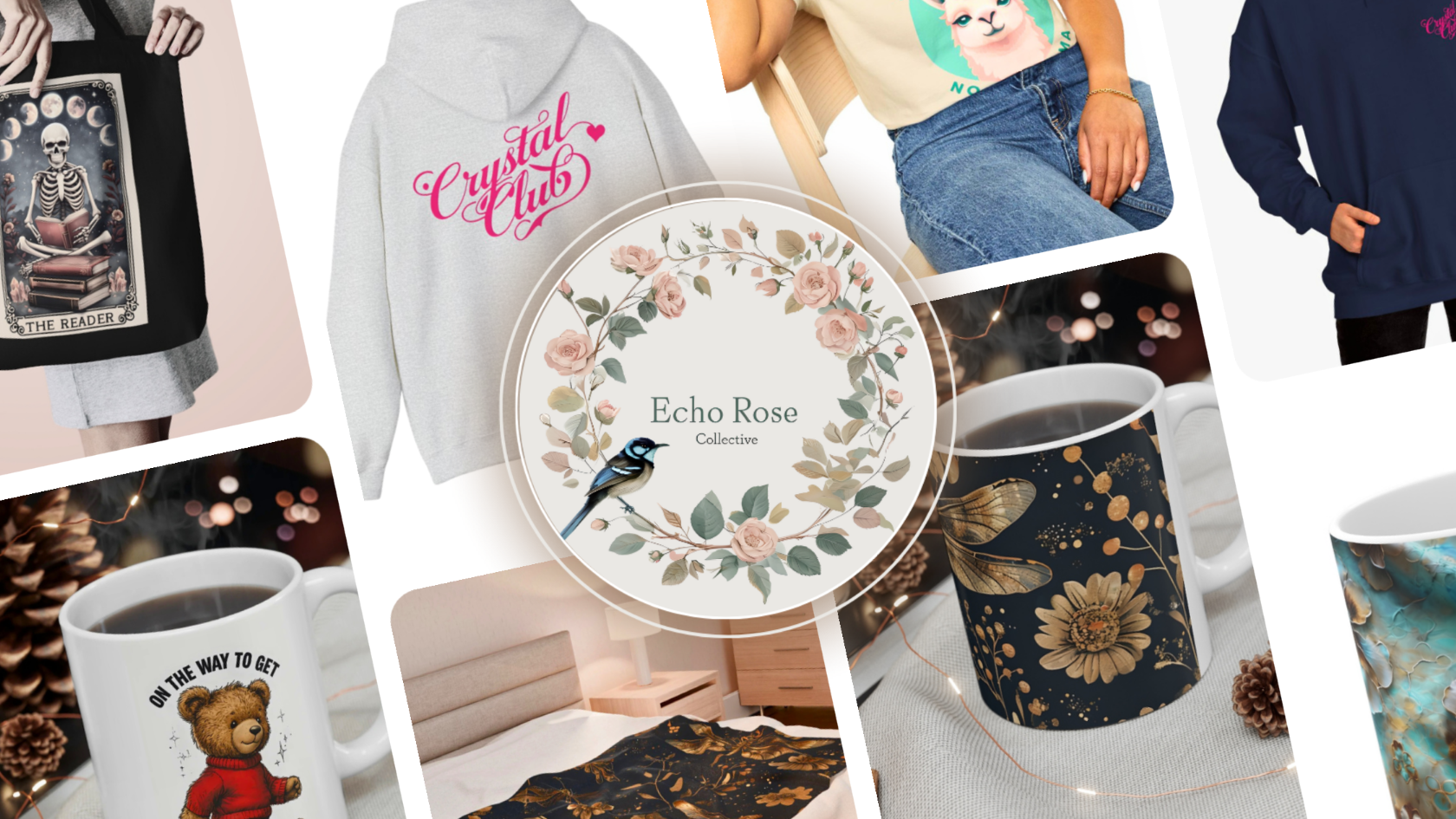 At Echo Rose Collective, we believe your style should reflect your energy. Our crystal inspired designs bring meaning and modern aesthetics together, from statement tees and cozy hoodies to mugs, phone cases, and more. Whether you’re shopping for yourself or searching for the perfect gift, every piece is designed to spark connection, confidence, and good vibes.