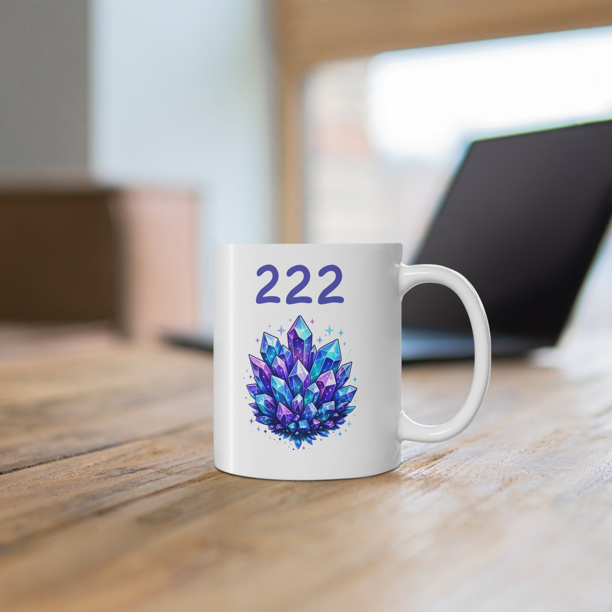 This ceramic coffee mug brings a quiet, magical pause to everyday routines. Crisp white ceramic showcases a jewel-toned crystal cluster and the calming number 222 in deep indigo — a small talisman on your morning counter. Hold the easy C-handle, feel the warmth through the glossy glaze, and notice the bright, detailed print from ORCA coating that keeps colors vivid wash after wash. It slips into your day whether you’re journaling with a candle lit, sketching at the kitchen table, or settling in for a late-night tarot session. The design reads like a private ritual for someone who notices patterns, seeks small signs, and collects quiet comforts.