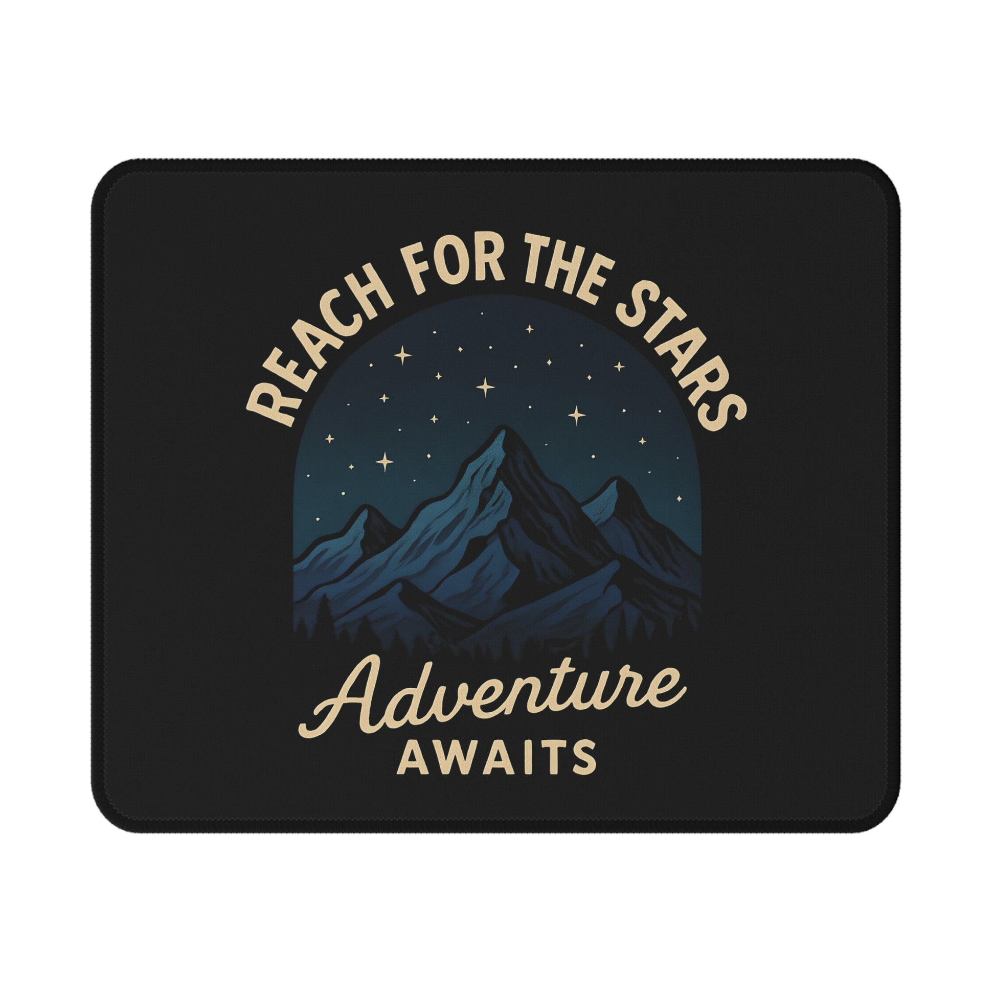 A compact, soft-surfaced mouse pad that brings a quiet sense of outdoor wonder to your desk. The dark, starry mountain artwork and vintage script—"Reach for the Stars" and "Adventure Awaits"—settle into the background while your mouse moves, creating a focused, calming workspace. The smooth polyester top gives precise sensor tracking and effortless gliding for both optical and laser mice, while the natural rubber base grips your desk so the pad stays put during intense clicks or long planning sessions. Subtle anti-fray edges and vivid, long-lasting print mean the design keeps its depth through daily use. This mouse pad fits small desks, travel setups, and bedside stations where inspiration and functionality meet.