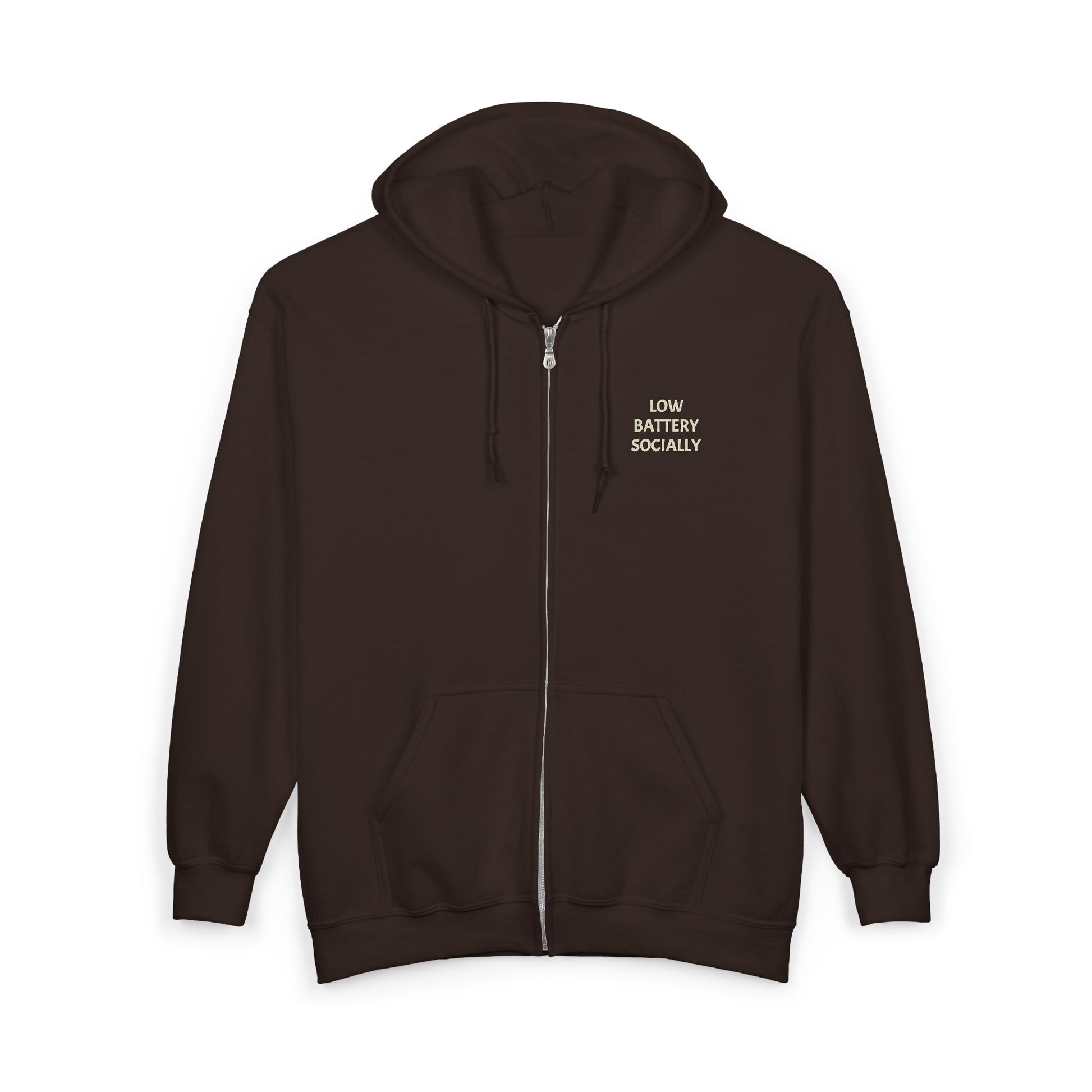 A roomy, dependable zip-up hoodie with a subtle voice. The soft midweight fabric wraps you in familiar comfort while a neat chest embroidery quietly reads "LOW BATTERY SOCIALLY," saying more with less. The full metal zipper and roomy front pockets make it easy to move through days—commutes, late-night study sessions, porch hangs—without fuss. It’s the kind of sweatshirt you reach for when you want something honest and low-key: warm ribs at the cuffs, a snug hood with matching drawcord, and a classic silhouette that layers cleanly over tees or under coats. Small wrist prints add a touch of modern print detail, and the left-chest embroidery keeps the statement restrained and wearable.