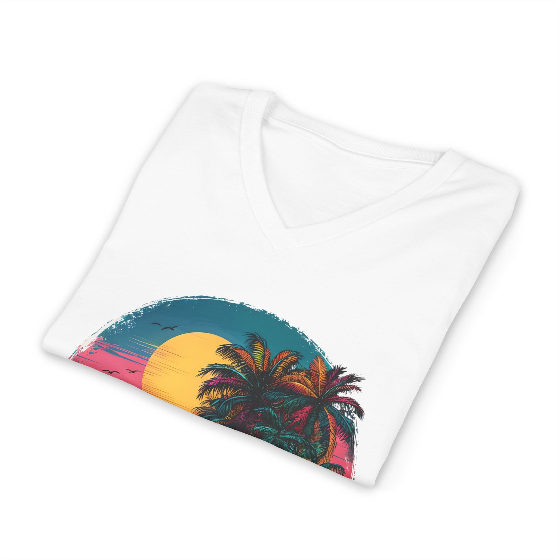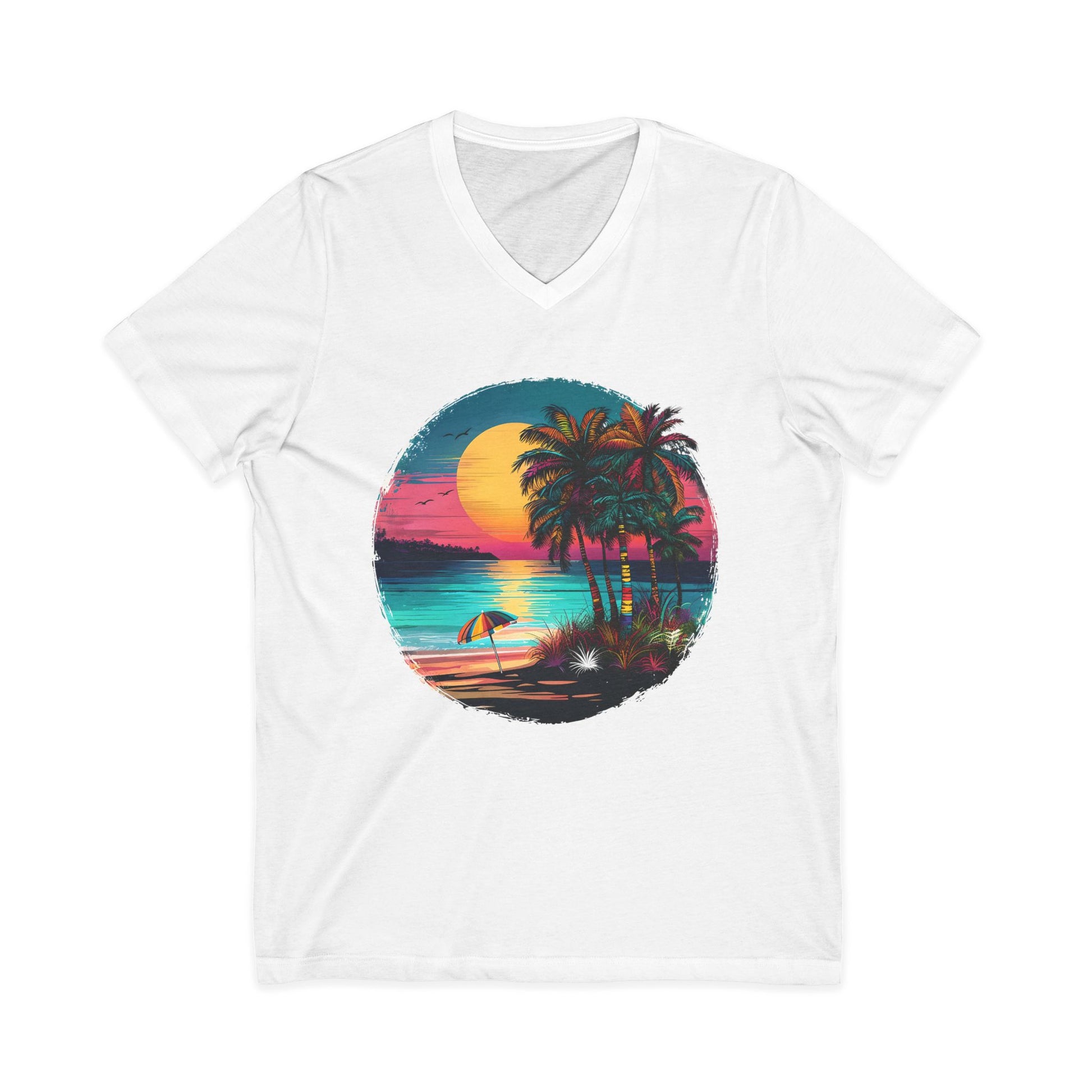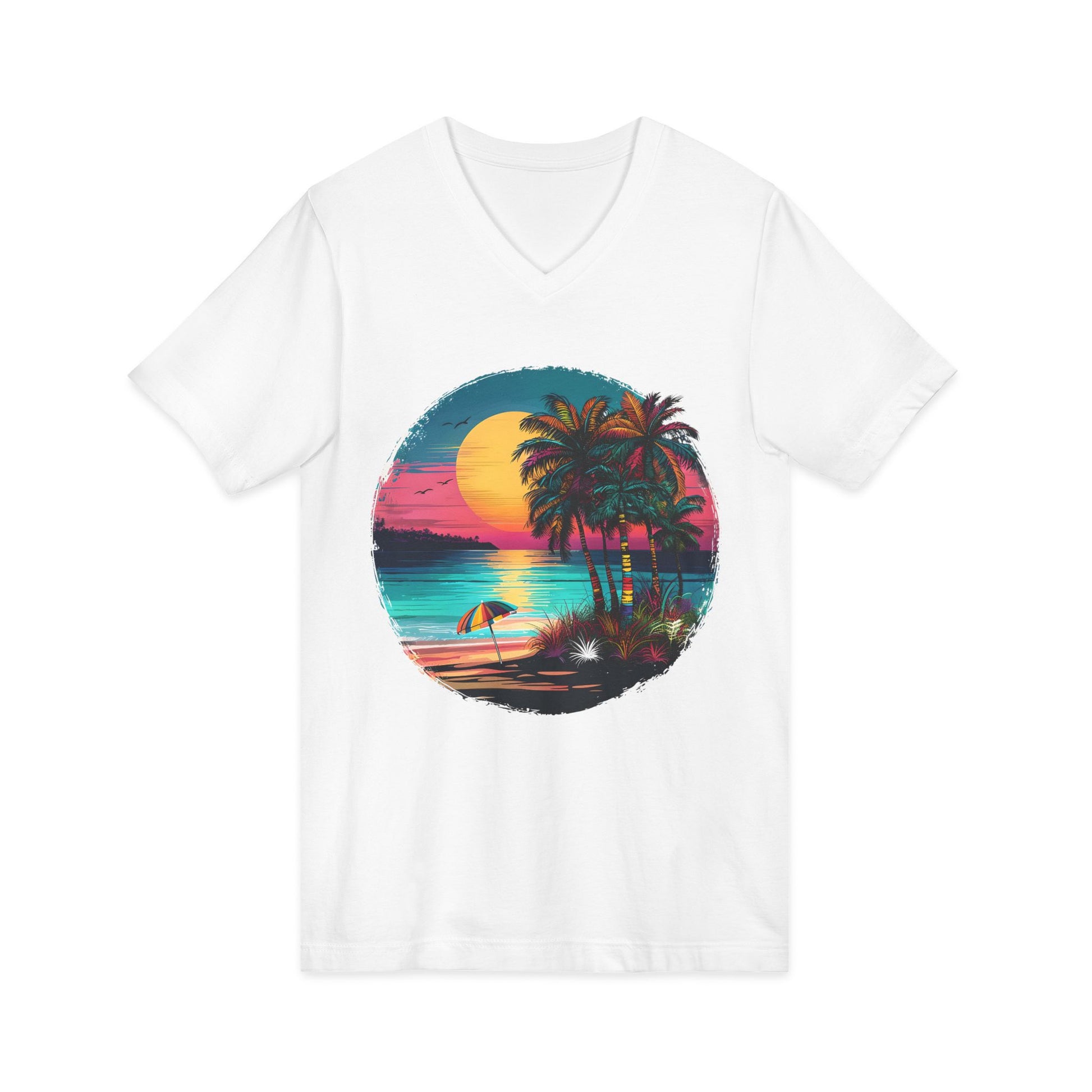 This lightweight V-neck tee carries a sunset-soaked beach scene that feels like a private pause at golden hour. Soft, breathable cotton drapes with a retail cut that flatters without clinging. The printed circular graphic — palms, surf, and a blazing sun — brings a nostalgic, laid-back mood to weekends, travel days, or evenings around a bonfire. Thoughtfully made with reinforced seams and a ribbed collar so the shirt keeps its shape wash after wash. Worn alone or layered under an open shirt, it slips instantly into a relaxed, seaside wardrobe.